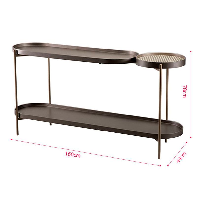 Aparador Bellagio é uma peça que une sofisticação e praticidade, sendo ideal para compor diversos ambientes da sua casa. Ideal para ser usado na sala de estar como um ponto focal, decorando-o com quadros, livros e objetos de arte, criando um espaço acolhedor e convidativo. Na sala de jantar, próximo à mesa de jantar como uma opção prática para servir refeições ou como um suporte para utensílios de festa, mantendo tudo ao seu alcance.Com uma estrutura robusta em aço carbono, sua pintura na cor metalizada champagne confere um toque contemporâneo e luxuoso, perfeito para quem busca um móvel que se destaque na decoração.Com duas prateleiras oblongas, uma superior e outra inferior, ambas em lâmina de madeira na cor bronze. A bandeja redonda com borda laminada e tela palha traz um charme adicional, ideal para servir drinks ou expor pequenas plantas e arranjos florais. Essa combinação de materiais não apenas realça a estética da peça, mas também proporciona um espaço funcional para organizar objetos e exibir itens decorativos. Com seu design versátil e elegante, o Aparador Bellagio é uma escolha ideal para quem deseja adicionar um toque de classe e funcionalidade a qualquer ambiente.