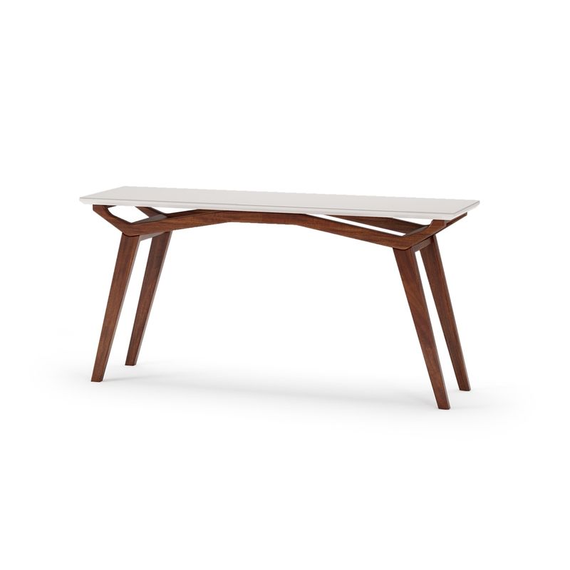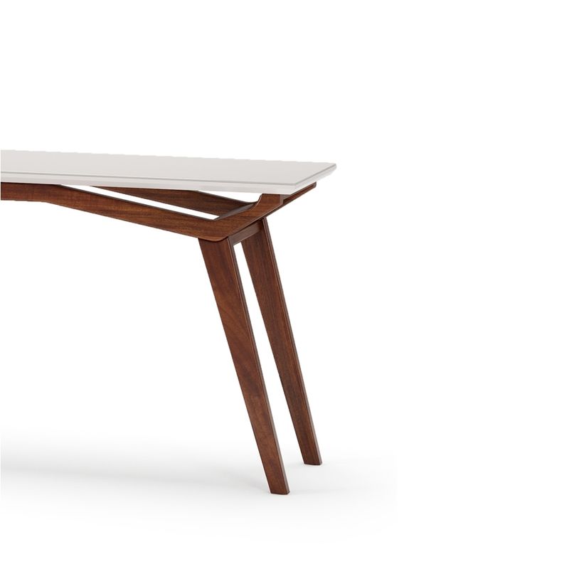 O Aparador Olegario com seu tampo branco oferece um contraste interessante com a madeira na cor castanho, criando um visual leve e contemporaneo. As pernas finas e o detalhe curvo na estrutura de madeira trazem um charme especial e, a peca se adapta facilmente a diversos estilos de decoracao.