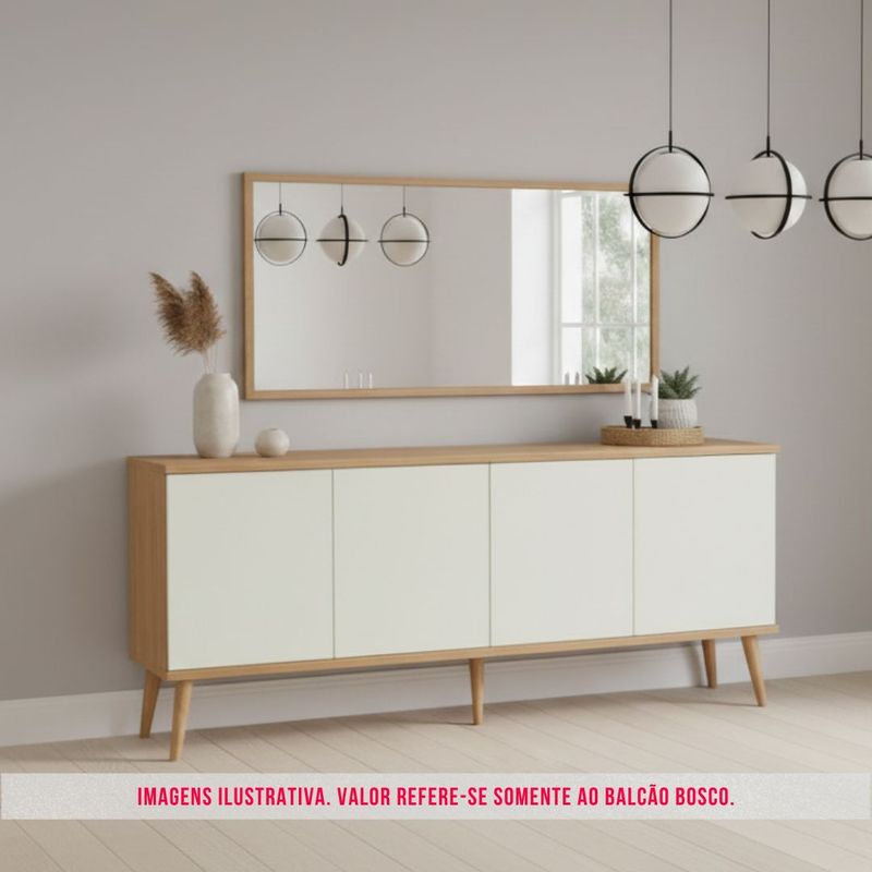 O Balcão Bosco é a peça ideal para quem busca unir a estética *clean* do design contemporâneo com uma funcionalidade superior. Medindo impressionantes 180cm, ele se destaca como robusto e elegante, perfeitamente dimensionado para a sala de jantar, sala de estar ou até mesmo um *hall* sofisticado.Sua estrutura é trabalhada na acolhedora tonalidade Freijó, uma madeira clara que traz a leveza e o aconchego característicos do design escandinavo, garantindo durabilidade e um toque natural ao ambiente. O contraste é criado por suas quatro portas frontais, que se apresentam em um suave e versátil tom Off-White. Esta combinação de cores neutras e orgânicas confere ao Bosco uma facilidade notável de harmonização com diferentes paletas decorativas e estilos de interiores.Além de seu apelo visual, o grande diferencial do Bosco reside na sua organização interna. As quatro portas escondem um amplo espaço de armazenamento, fundamental para manter sua casa organizada. Para um controle mais eficiente de talheres, pequenos acessórios de mesa ou documentos importantes, o balcão inclui gaveta interna discretas e de fácil acesso, otimizando cada centímetro da peça.A base é sustentada por pés angulados, um charme que eleva o móvel e facilita a limpeza, reforçando seu ar moderno e arejado. O Balcão Bosco é a síntese perfeita de forma e função: uma peça que decora com sobriedade, enquanto oferece toda a capacidade de armazenamento que um lar prático e elegante exige.