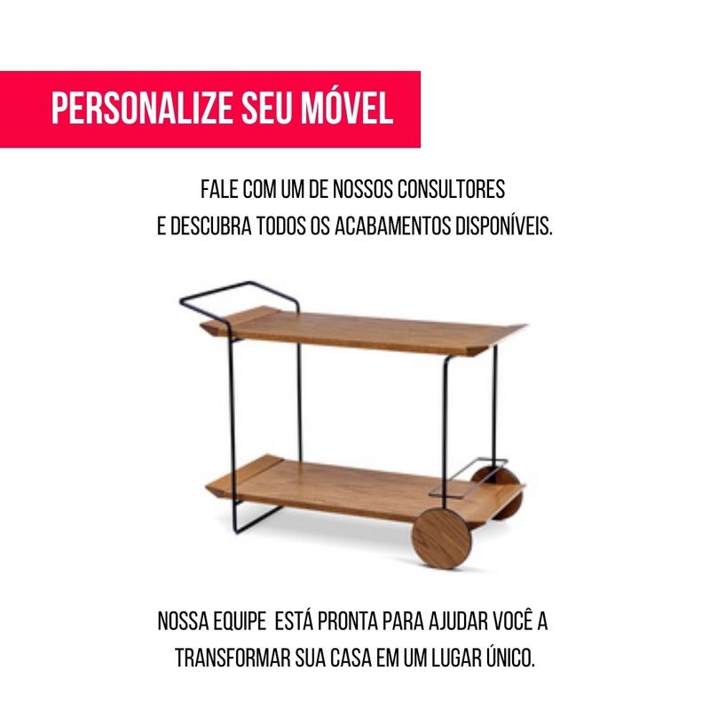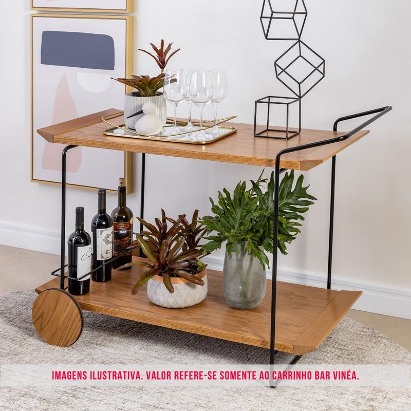 Apresentamos o Carrinho Bar Vinéa, uma peça que combina a sofisticação moderna com a funcionalidade prática, ideal para quem aprecia a arte de servir. As prateleiras são confeccionadas em lâmina de Carvalho Amêndoa, uma madeira nobre que traz uma textura rica e um tom quente e acolhedor, adicionando um toque de elegância natural ao seu espaço.A estrutura do carrinho é feita em aço de alta qualidade com acabamento em preto acetinado, que confere um visual contemporâneo e minimalista. O contraste entre a madeira e o aço cria uma harmonia visual perfeita, transformando o carrinho em um item de destaque na sua sala de jantar, sala de estar ou até mesmo em um home office.Pensado para a conveniência, o Vinéa conta com um design inteligente que inclui um porta-garrafas integrado, garantindo que suas bebidas fiquem seguras e organizadas. A mobilidade é garantida pelos rodízios discretos e resistentes, que permitem movimentar o carrinho com facilidade para qualquer ambiente, seja para servir coquetéis em uma festa ou para ter suas bebidas favoritas sempre à mão. O Carrinho Bar Vinéa é mais do que um móvel; é uma declaração de estilo e uma solução elegante para o entretenimento.Disponível em outros acabamentos. Consulte-nos!
