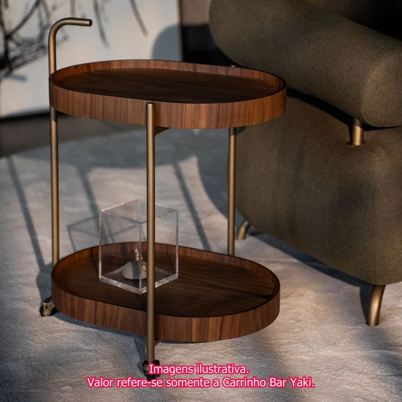 Carrinho Bar Zaki, elegância funcional para compor seu ambiente com estiloCom um visual moderno e materiais de alta qualidade, ele é uma peça versátil que agrega charme e funcionalidade aos mais diversos espaços.Este carrinho se destaca por suas bandejas em lâmina de madeira Nogueira, que oferecem um toque natural e acolhedor, além de um acabamento elegante e refinado. Cada bandeja exibe veios marcantes e tonalidade quente, realçando o visual contemporâneo do móvel.A base em aço carbono com pintura metalizada Gold traz brilho e resistência à estrutura, criando um contraste sofisticado com a madeira. Os rodízios discretos e funcionais permitem movimentar o carrinho com facilidade, garantindo mobilidade sem abrir mão da estética.As bandejas removíveis, proporcionando maior comodidade na hora de servir bebidas, petiscos ou mesmo transportar objetos entre ambientes. Essa funcionalidade torna o Carrinho Bar Zaki um verdadeiro aliado tanto em ocasiões especiais quanto no uso cotidiano. Você pode utilizar as bandejas separadamente sobre a mesa, balcão ou sofá, e depois recolocá-las com praticidade. Isso otimiza o tempo e facilita a interação com seus convidados.Graças ao seu design elegante e atemporal, o Carrinho Bar Zaki pode ser inserido em diversos contextos, como salas de estar e jantar, varandas gourmet, home office, quartos e suítes e em espaços comerciais como em recepções, salas de espera ou showrooms, ele complementa a decoração com elegância e funcionalidade.O Carrinho Bar Zaki é mais do que um móvel: é uma peça de destaque que valoriza a decoração e traz soluções práticas para o seu dia a dia. Ideal para quem busca estilo, conforto e versatilidade em um só produto.
