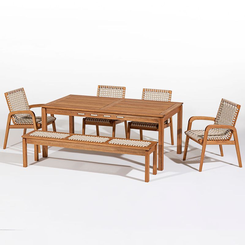 O Conjunto Trama 7 Lugares é ideal para quem busca um mobiliário elegante e durável para receber familiares e amigos. Composto por 01 Mesa Jantar Trama de 180 cm, 02 Bancos Trama de 3 lugares (180 cm cada), 02 Cadeiras Trama com braço e 02 Cadeiras Trama sem braço, o conjunto combina funcionalidade e design acolhedor. Sua estrutura em madeira de eucalipto com acabamento em stain na cor jatobá proporciona resistência e proteção contra desgastes externos, mantendo o aspecto natural e sofisticado da madeira.A variedade de assentos é um ponto alto: os bancos permitem maior aproveitamento do espaço e acomodação prática, enquanto as cadeiras com braço oferecem aconchego e ergonomia.A Corda Chata PET 100% reciclado na cor areia, aplicada nas laterais da mesa, no assento dos bancos e no assento e encosto das cadeiras, cria uma atmosfera suave e harmoniosa, perfeita para integrar com tons claros, fibras naturais e plantas na decoração.Leve para o seu espaço um conjunto que une beleza, conforto e sustentabilidade. Conheça toda a Linha Trama e transforme a forma de receber!