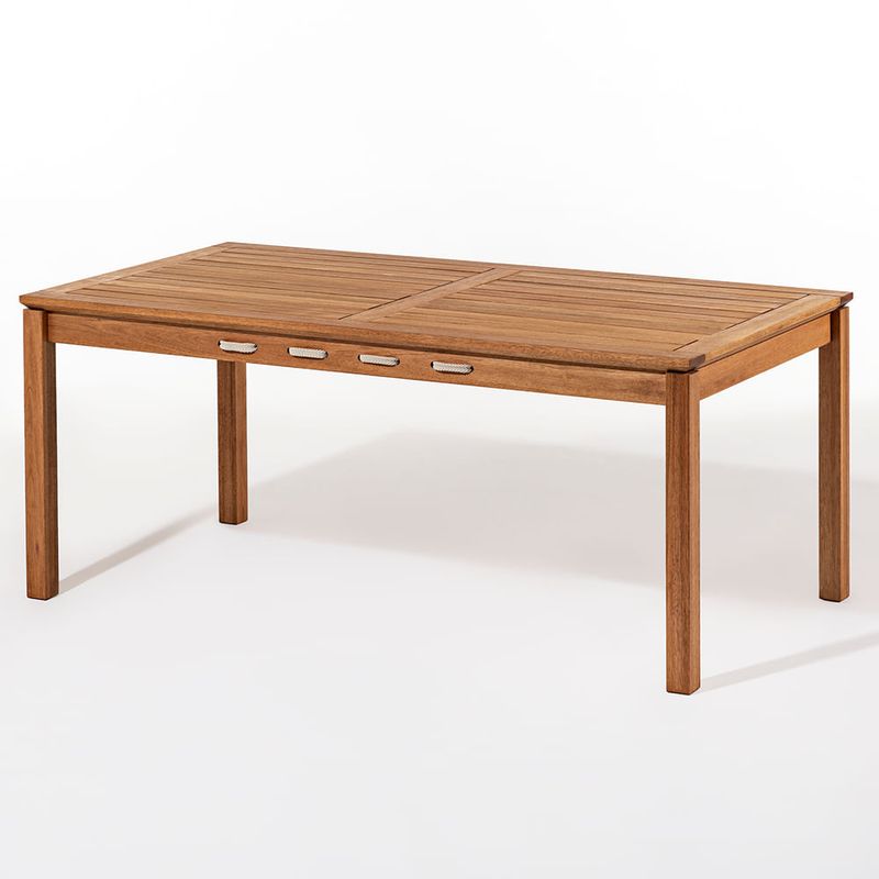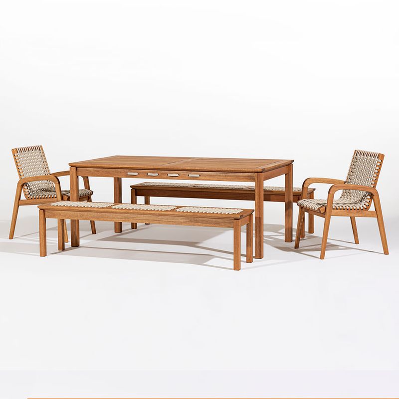 O Conjunto Trama traz um design que combina aconchego e requinte, ideal para transformar seu ambiente externo em um espaço acolhedor. Reunindo beleza e qualidade, o conjunto conta com 01 Mesa Jantar Trama, 02 Bancos Trama de 3 lugares (180 cm de largura cada) e 02 Cadeiras Trama com Braço. Todas as peças são produzidas em madeira de eucalipto reflorestado e finalizadas com o elegante stain na cor jatobá, perfeito para resistir ao clima e embelezar áreas externas.O diferencial está na corda chata PET 100% reciclado na cor areia, aplicada nas laterais da mesa, no assento dos bancos e no assento e encosto das cadeiras. Essa tonalidade clara e natural cria leveza visual e transmite sensação de frescor, perfeita para composições externas que buscam harmonia e suavidade.O conjunto acomoda até 08 pessoas, tornando os encontros ao ar livre ainda mais agradáveis. Descubra toda a Linha Trama e inspire-se para compor seu espaço dos sonhos.