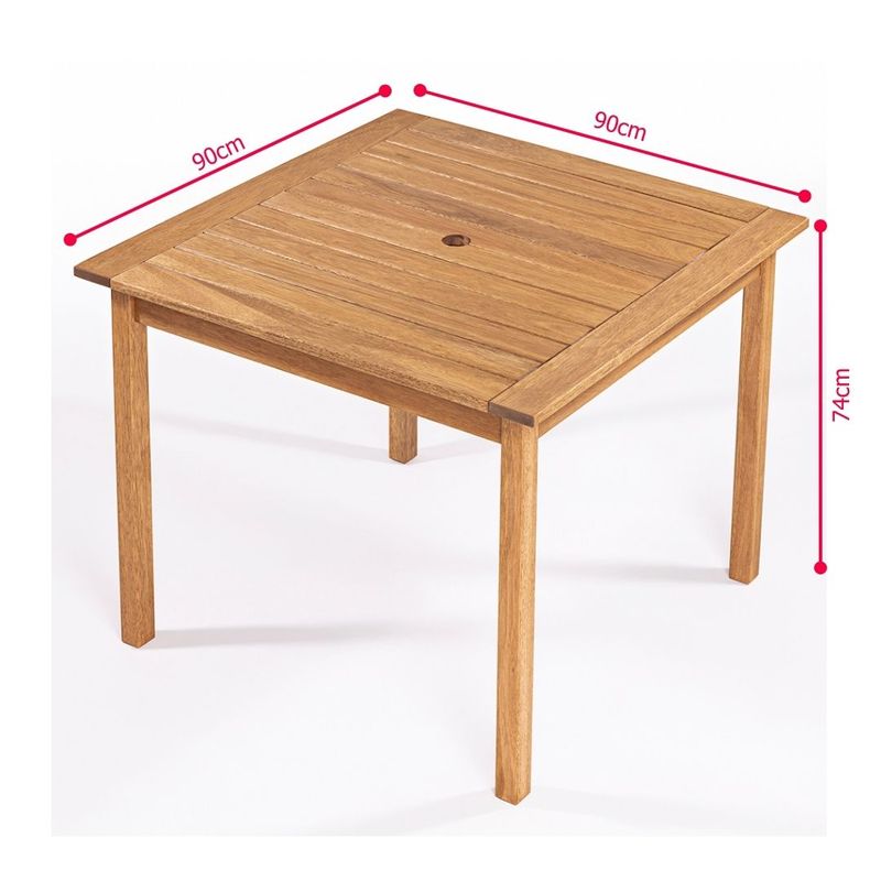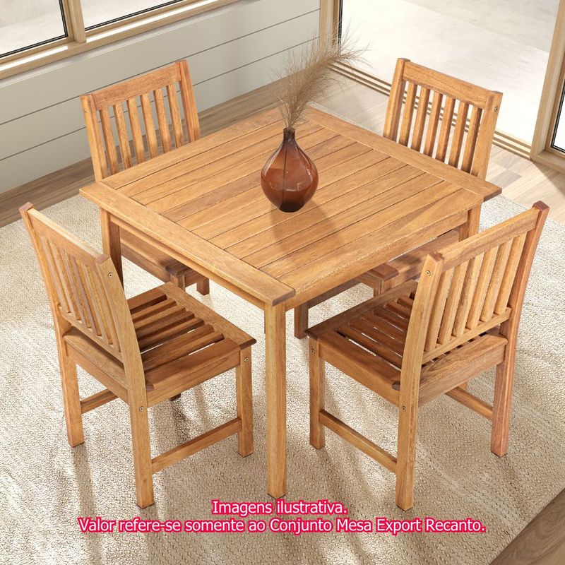O Conjunto Mesa Export Recanto foi pensado para oferecer conforto, durabilidade e beleza na medida certa para o seu espaço externo. Composto por 01 Mesa Export Quadrada 90cm e 04 Cadeiras Recanto Reta 44cm, é produzido em madeira maciça de eucalipto com acabamento em Stain na cor Jatobá, que protege contra sol, chuva e umidade, além de realçar os veios e a tonalidade natural da madeira.A mesa de 90cm acomoda confortavelmente até 4 pessoas, enquanto as cadeiras proporcionam assento firme e ergonômico, garantindo conforto mesmo em longos períodos de uso. A combinação entre o design robusto e o acabamento refinado cria um conjunto elegante, ideal para varandas, áreas gourmet, jardins ou decks.Além da beleza e resistência, a manutenção é simples, permitindo que o conjunto permaneça impecável por muitos anos.Linha Export, várias opções para você montar, do seu jeito, um ambiente externo perfeito para viver bons momentos.