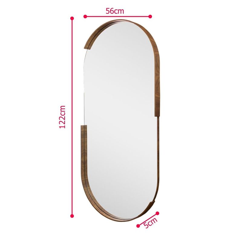 Espelho Maceio, a elegância refletida em nogueira.Com suas generosas dimensões de 56x122cm, o Espelho Maceio Grande, transcende a funcionalidade básica de um espelho, tornando-se uma peça central de requinte e sofisticação para o seu ambiente. Sua presença imponente não apenas amplia visualmente o espaço, como também irradia um charme clássico e atemporal.A moldura, cuidadosamente confeccionada em lâmina de madeira na tonalidade nogueira, exala calor e nobreza. A rica coloração e os veios naturais da madeira proporcionam uma sensação de aconchego e elegância terrosa.A moldura oval é adornada por recortes elevados que conferem uma textura sutil e um dinamismo visual encantador. A luz que incide sobre esses recortes cria um jogo de sombras elegante, realçando a beleza da moldura e adicionando profundidade ao design.A versatilidade do Espelho Maceio Grande permite que ele seja utilizado de diversas maneiras. Sozinho, em uma parede de destaque, e com a possibilidade de combinar o Espelho Maceio Grande com outras medidas da mesma linha oferece uma oportunidade única de criar composições personalizadas e harmoniosas. Ao escolher o Espelho Maceio Grande, você não está apenas adquirindo um objeto funcional, mas sim uma peça de decoração que eleva o nível estético do seu lar. Ele é a união perfeita entre a beleza da madeira nobre, o charme dos detalhes elevados e a versatilidade de uma peça pensada para compor e enriquecer seus espaços com elegância duradoura.