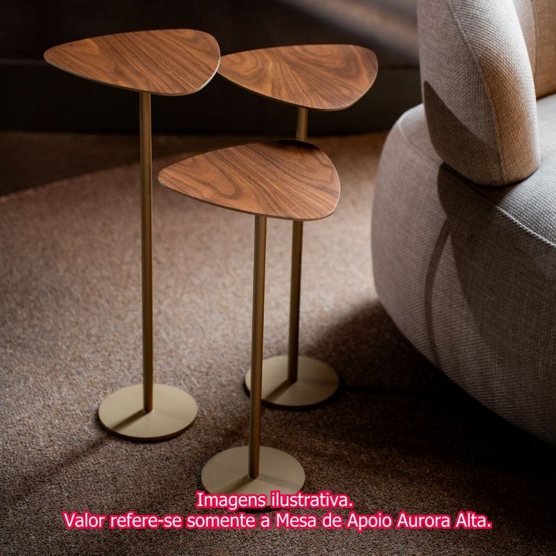 A Mesa de Apoio Aventura, em sua versão alta com 58cm, personifica a união entre a beleza natural da lâmina de madeira cor nogueira e a sofisticação do aço carbono pintado em champagne. Este móvel transcende sua funcionalidade básica, tornando-se um elemento chave na composição de ambientes acolhedores e cheios de estilo.Seu design elegante e minimalista permite uma integração harmoniosa em diversos espaços da casa. Na sala de estar, a Aventura Alta se destaca ao lado de sofás e poltronas, oferecendo uma superfície de apoio ideal para livros, revistas, um charmoso vaso de flores ou até mesmo uma luminária que realce a atmosfera do ambiente. No quarto, pode servir como um elegante criado-mudo, abrigando seus objetos pessoais e um ponto de luz suave.A versatilidade da Mesa de Apoio Aventura Alta se revela ainda mais quando combinada com suas versões Média e Baixa. A criação de um conjunto de mesas em diferentes alturas não só dinamiza o espaço, como também oferece múltiplas possibilidades de uso. Essa sobreposição de alturas e a continuidade do design criam um ponto focal interessante e funcional no ambiente.Seja como um elemento individual de destaque ou como parte de um conjunto sofisticado, a Mesa de Apoio Aventura Alta é a escolha perfeita para quem busca um toque de requinte e praticidade na decoração. Sua beleza atemporal e a qualidade dos materiais garantem que ela seja um investimento duradouro para o seu lar.Disponível em outros acabamentos. Consulte-nos!