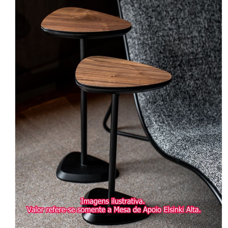 Com um design que equilibra elegância atemporal e modernidade sutil, a Mesa de Apoio Elsinki é uma peça que se destaca pela sofisticação dos materiais e pela leveza visual. Seu tampo, em lâmina natural de madeira nogueira, exibe tons quentes e veios orgânicos que trazem aconchego ao ambiente. Já a base metálica, com acabamento na refinada cor champagne metalizado, acrescenta brilho discreto e um toque contemporâneo, criando um contraste elegante com a madeira.A altura elevada da peça a torna perfeita como apoio lateral para poltronas e sofás mais altos, funcionando também como mesa de destaque em composições com vasos, luminárias ou livros de arte. Seu visual leve e imponente permite que se integre com facilidade em projetos que vão do clássico ao moderno, valorizando cada detalhe do espaço.