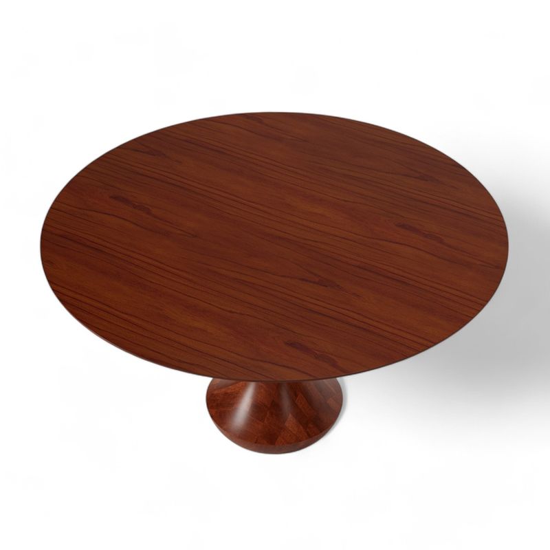 Alem de sua estetica refinada, a estrutura garante durabilidade e estabilidade, sendo ideal para espacos que priorizam estilo e funcionalidade. Seu tampo redondo em madeira castanho proporciona um toque de requinte, enquanto sua base central robusta e esculpida garante um visual unico e contemporaneo.
