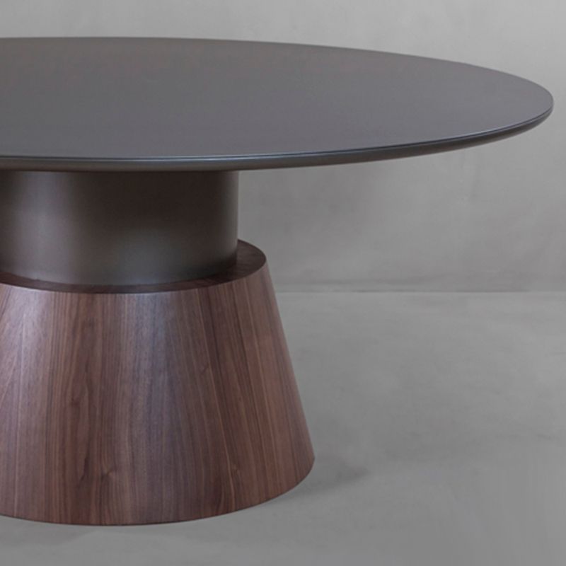 Com 140cm de diâmetro, a Mesa de Jantar Pricely é a escolha ideal para quem busca um equilíbrio entre presença marcante e funcionalidade. Seu tampo redondo em lâmina pintada na cor Bronze com sobreposição em vidro eleva o nível de sofisticação da composição. A base superior segue a estética do tampo, enquanto a base inferior, em lâmina de madeira Nogueira, adiciona textura e profundidade ao design. Sofisticada e acolhedora, esta mesa é perfeita para reunir até cinco pessoas com muito charme, tornando qualquer refeição uma ocasião especial.