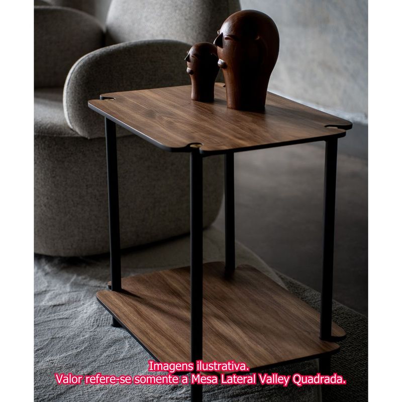 Mesa Lateral Ravena Quadrada, imponência e elegância em um design atemporal.Personificação da sofisticação atemporal e da funcionalidade robusta. Com um design que exala presença em cuidado meticuloso com os materiais, esta peça é perfeita para quem busca elevar a estética de qualquer ambiente.Com seus tampos superior e inferior laminados em madeira natural na cor nogueira, a Mesa Ravena exibe a beleza inconfundível e a profundidade dos tons da nogueira. A escolha da madeira natural confere não apenas uma durabilidade excepcional, mas também uma textura rica e veios únicos, garantindo que cada mesa seja uma peça singular. A repetição do acabamento em nogueira nos dois tampos cria uma sensação de continuidade e solidez visual, adicionando um toque de calor e imponência ao seu espaço.A estrutura é formada por hastes em aço carbono em preto, que oferecem um contraste marcante e moderno. O acabamento preto metalizado não só assegura a estabilidade e resistência necessárias, mas também adiciona um ar de sofisticação industrial que complementa perfeitamente a calidez da madeira. Este jogo de texturas e cores entre o natural e o metálico confere à mesa um caráter distintivo.Para arrematar a peça, as ponteiras em latão são o detalhe que faz toda a diferença. Esses pequenos elementos adicionam um brilho discreto e um toque de luxo e refinamento, elevando o design da Mesa Lateral Ravena a um patamar superior.Seja na sala de estar, no escritório ou em um hall de entrada, a Mesa Lateral Ravena Quadrada é mais do que um simples apoio; é um statement de design, ideal para quem aprecia a qualidade excepcional, o design pensado e a presença marcante que um móvel pode oferecer.