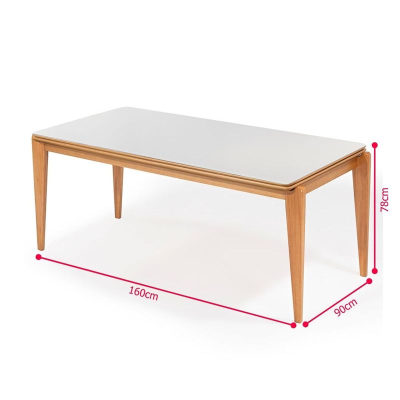 A Mesa de Jantar Retangular Rana é uma peça que une elegância, funcionalidade e acabamento refinado. Seu tampo é produzido em MDF laminado com vidro sobreposto colado na cor Off White, garantindo um visual moderno, superfície lisa e fácil de limpar. A combinação entre o vidro sofisticado e o laminado confere charme e praticidade ao dia a dia.A base é fabricada em madeira tauari, material resistente e nobre, com acabamento em verniz na cor mel, valorizando os veios naturais da madeira e proporcionando um toque de aconchego ao ambiente. Com 160cm de largura, essa versão acomoda confortavelmente até 6 pessoas, sendo ideal para salas de jantar compactas ou ambientes integrados. Uma escolha perfeita para quem busca sofisticação com proporções bem resolvidas.Sofisticação em cada detalhe, no tamanho ideal para o seu dia a dia.