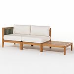 Apresentamos o Conjunto Aurora com Sofá de Canto 02 Lugares e Mesa de Centro Aurora, uma peça versátil e sofisticada que combina funcionalidade com design contemporâneo. Ideal para áreas externas como varandas, jardins ou lounges, esse conjunto foi pensado para proporcionar conforto e praticidade sem abrir mão da elegância.O sofá de canto é composto por generosas almofadas de assento e encosto, todas revestidas em tecido acquablock na cor areia, material resistente à água e ao desbotamento, perfeito para ambientes externos. A estrutura em madeira tauari, que recebe acabamento em verniz na cor mel traz calor e aconchego ao ambiente, enquanto o detalhe em fita náutica na cor verde oliva, aplicado no encosto lateral, garante firmeza às almofadas e adiciona um charme artesanal ao design.A composição inclui ainda a Mesa de Centro Aurora, com base ripada também em madeira, ideal para apoiar objetos decorativos, bandejas, bebidas ou livros, oferecendo mais praticidade ao seu momento de descanso ou recepção.O Conjunto Aurora é modular, o que permite diferentes composições conforme o espaço disponível ou o uso desejado, sendo uma excelente escolha para quem valoriza estilo, durabilidade e flexibilidade em ambientes ao ar livre.